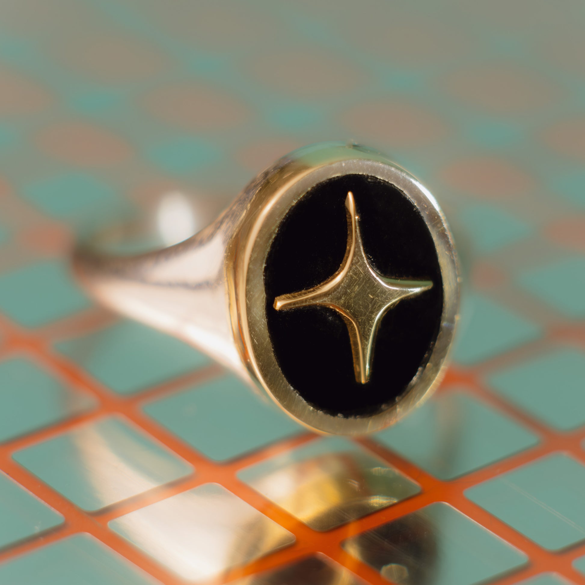 Inlaid ring with a hand-cut gold sparkle affixed to the center