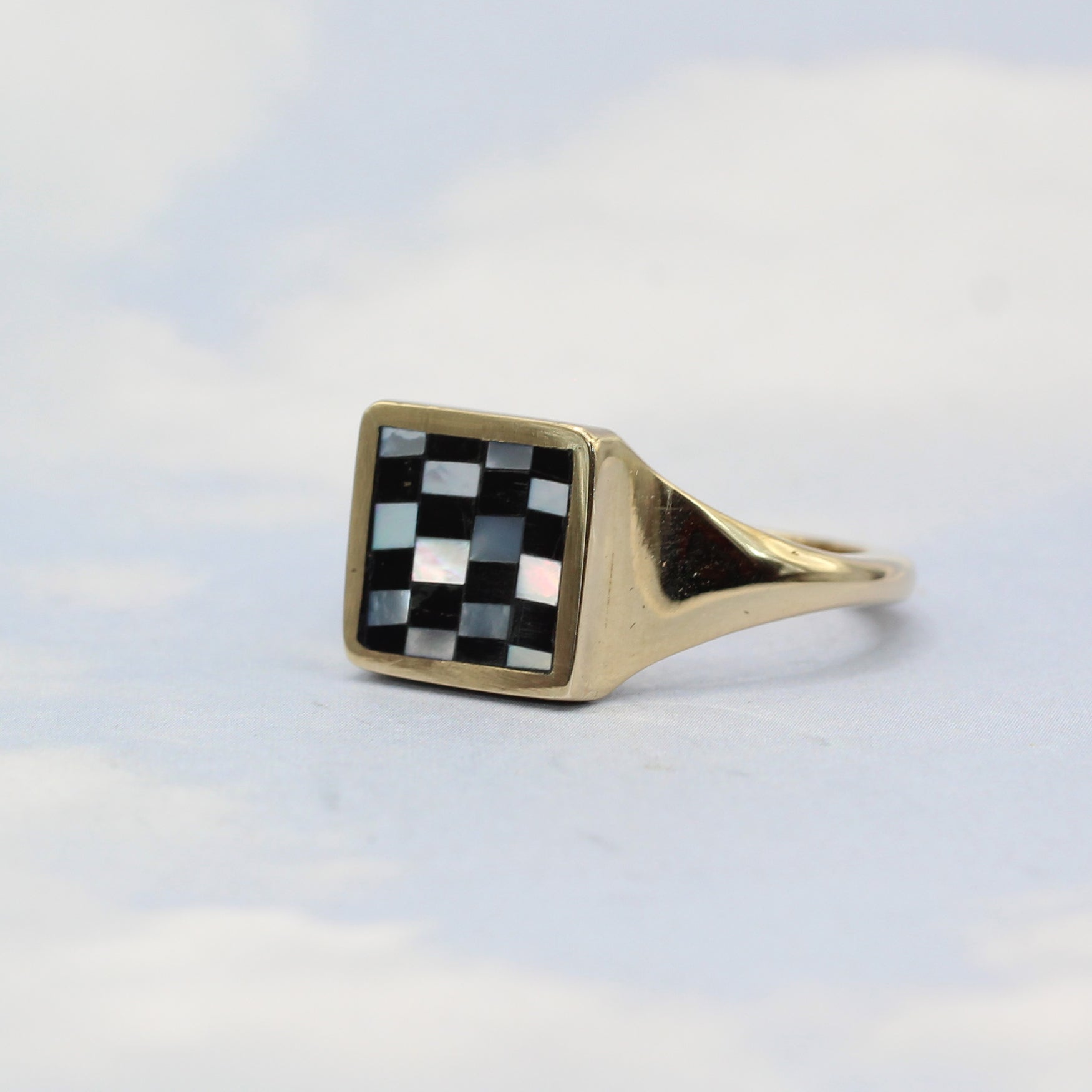 Sterling silver ring has a 14k yellow gold bezel and inlaid stone. Signet measures 12 mm by 12 mm and band tapers to 2 mm.