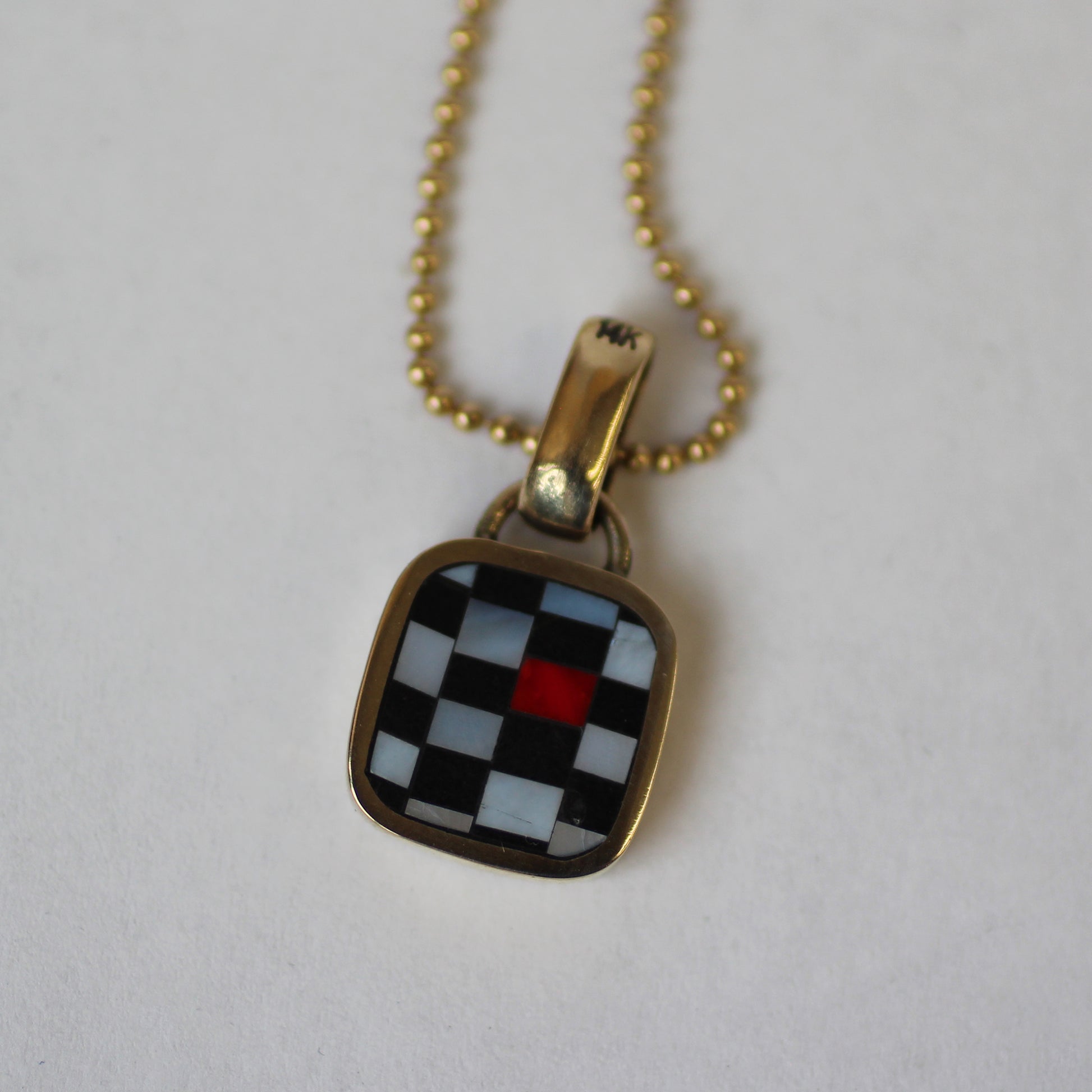 This 14k yellow gold pendant is inlaid with black jade, rosarita, and mother of pearl. Pendant measures 12mm x 16mm. Back of pendant has a Good Luck stamp, and bail has inner diameter of 7mm