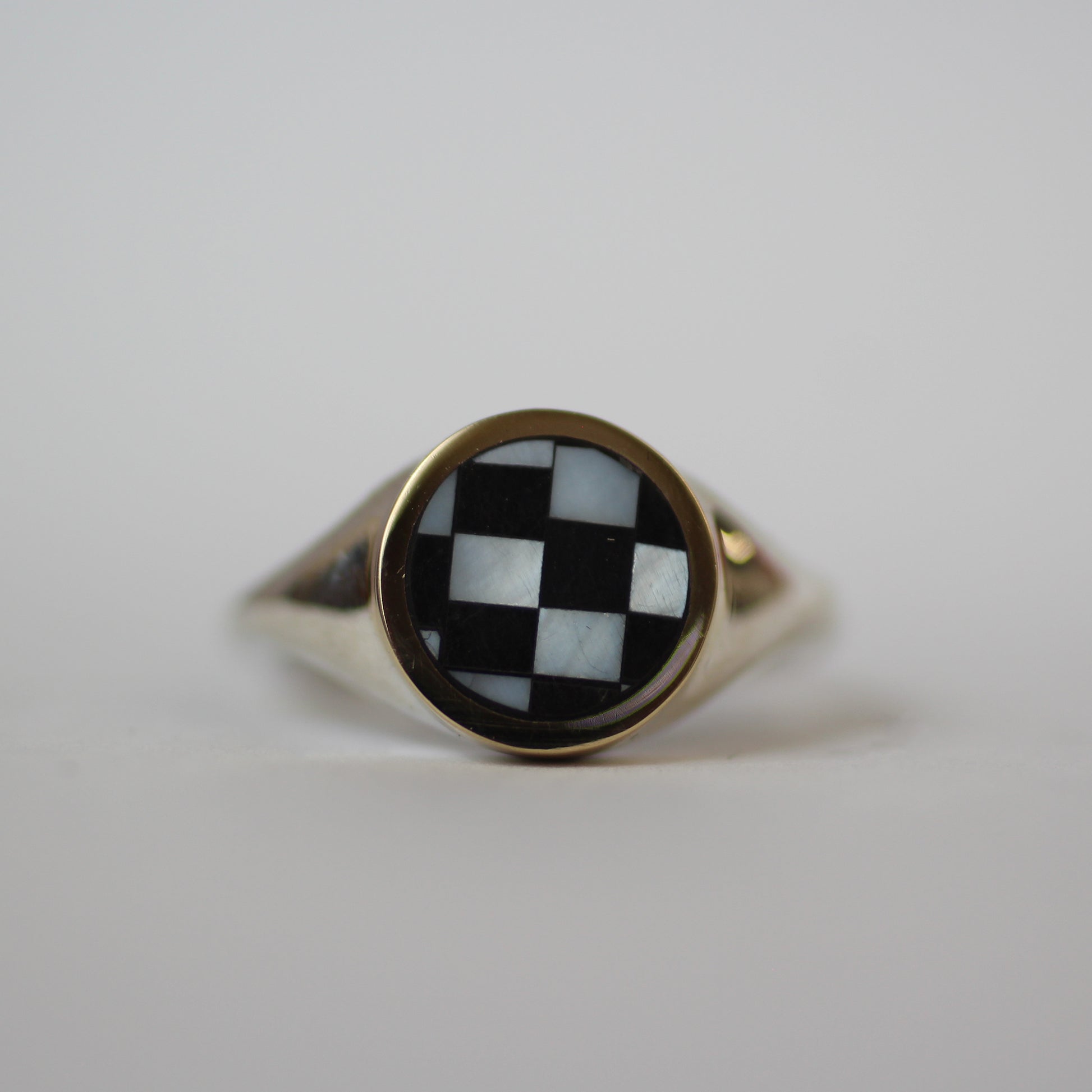 Sterling silver ring has a 14k yellow gold bezel and inlaid black jade and mother of pearl. Signet measures 11 mm by 11 mm and band tapers to 2 mm.