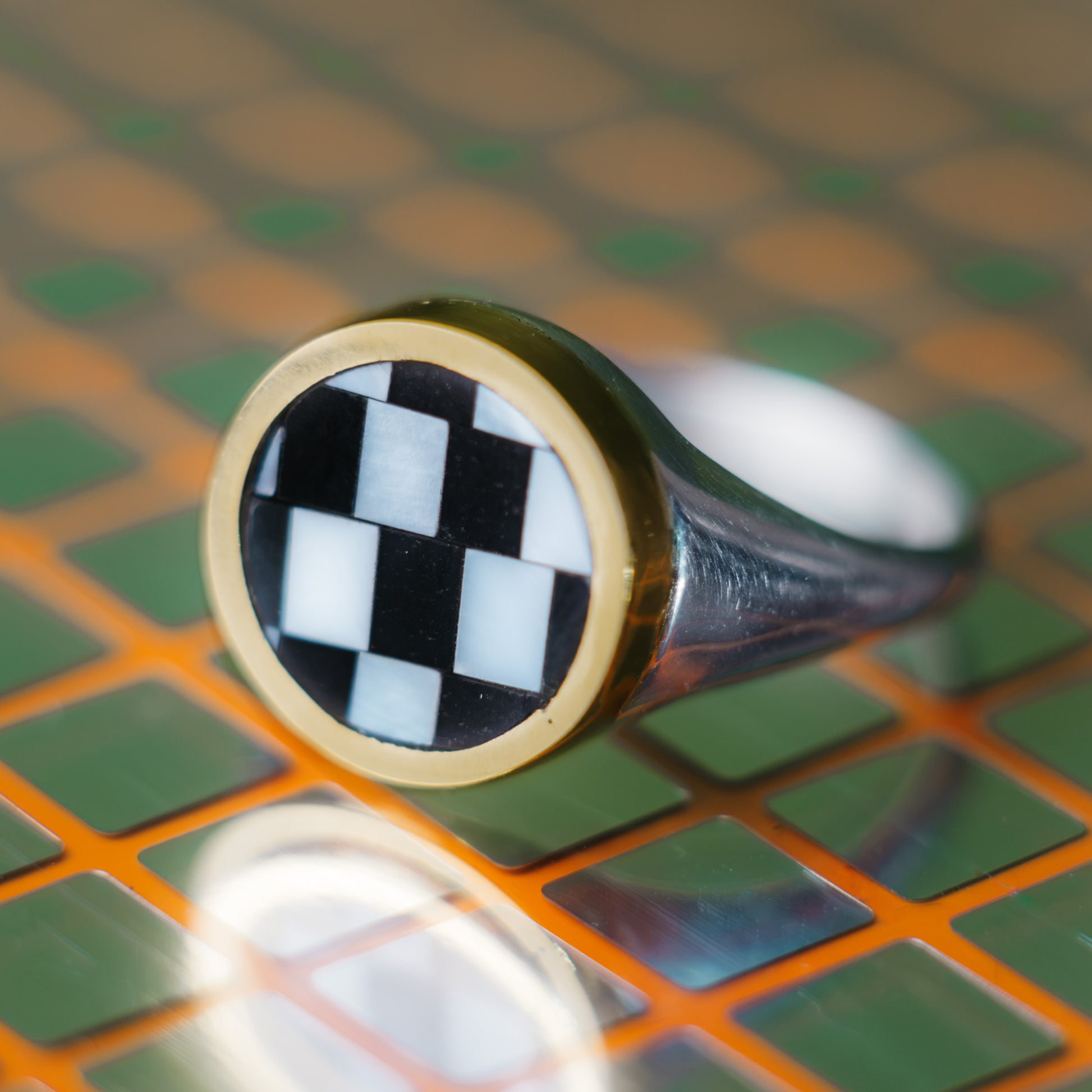 Hand-cut pearl and black jade in a 14k yellow gold bezel and sterling ring