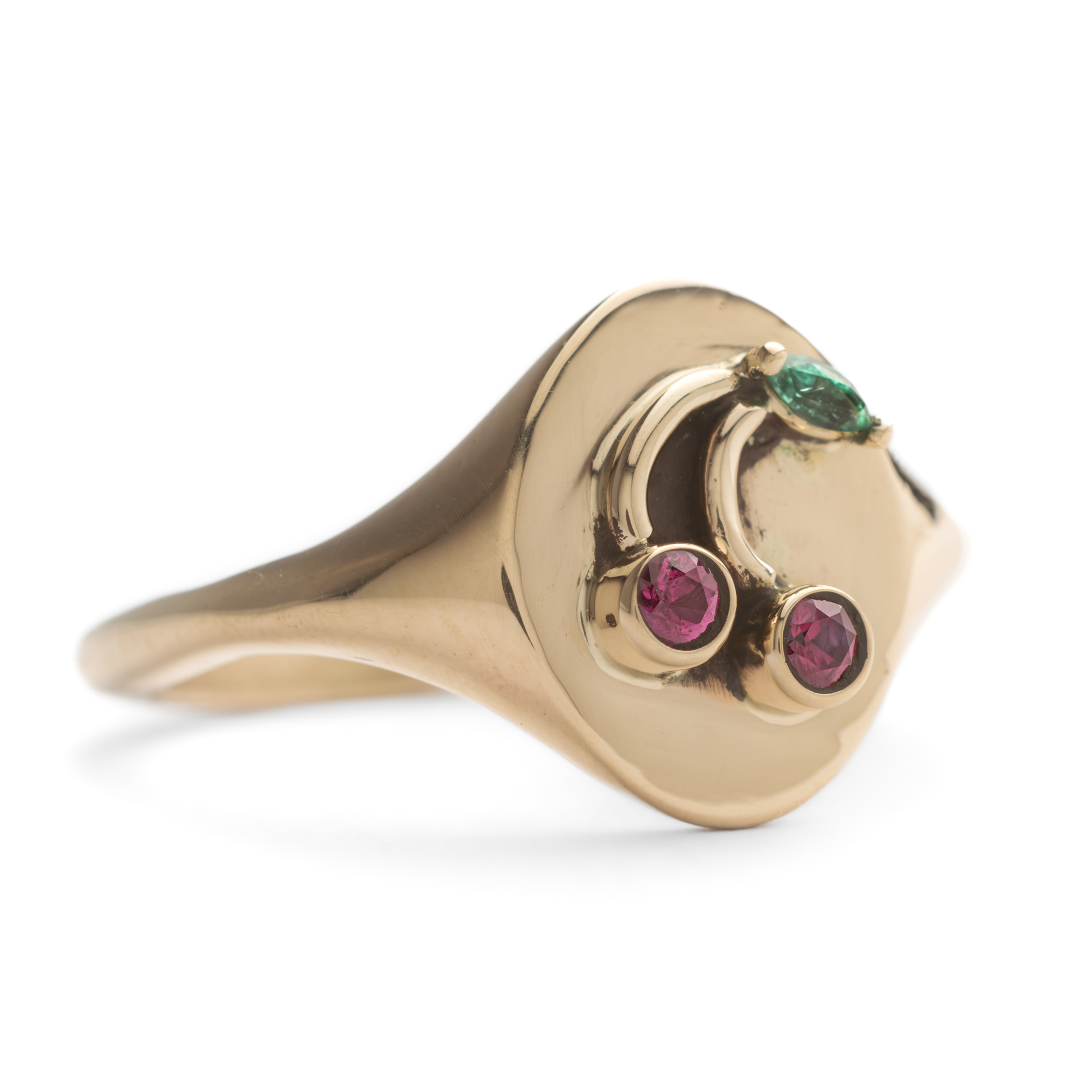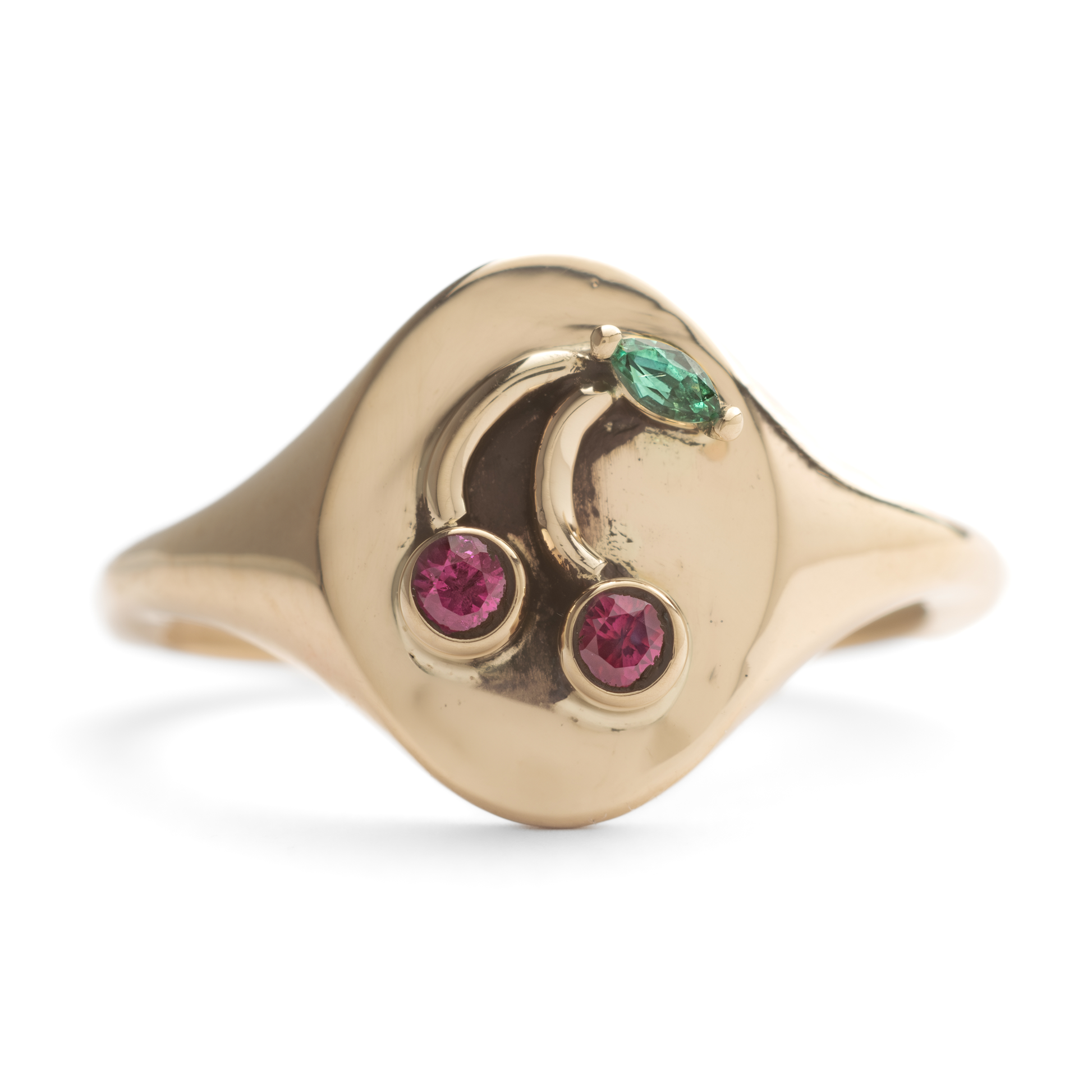 14k yellow gold signet with natural rubies and emerald. Can be resized up or down one size, please email us with final size
