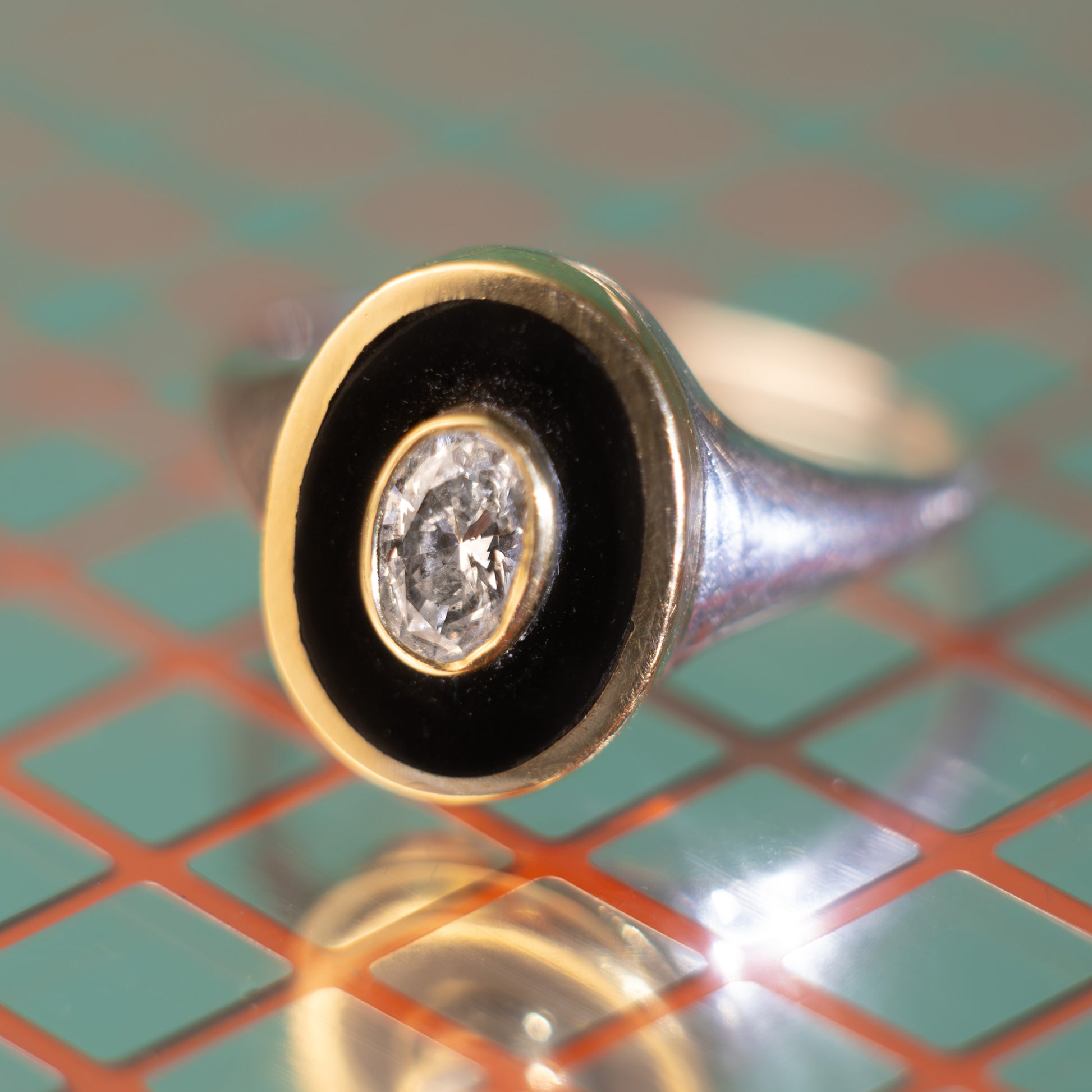 Mixed metal inlaid ring with a bezel set 1/4ct (approximate) natural SI1 diamond inlaid at the center