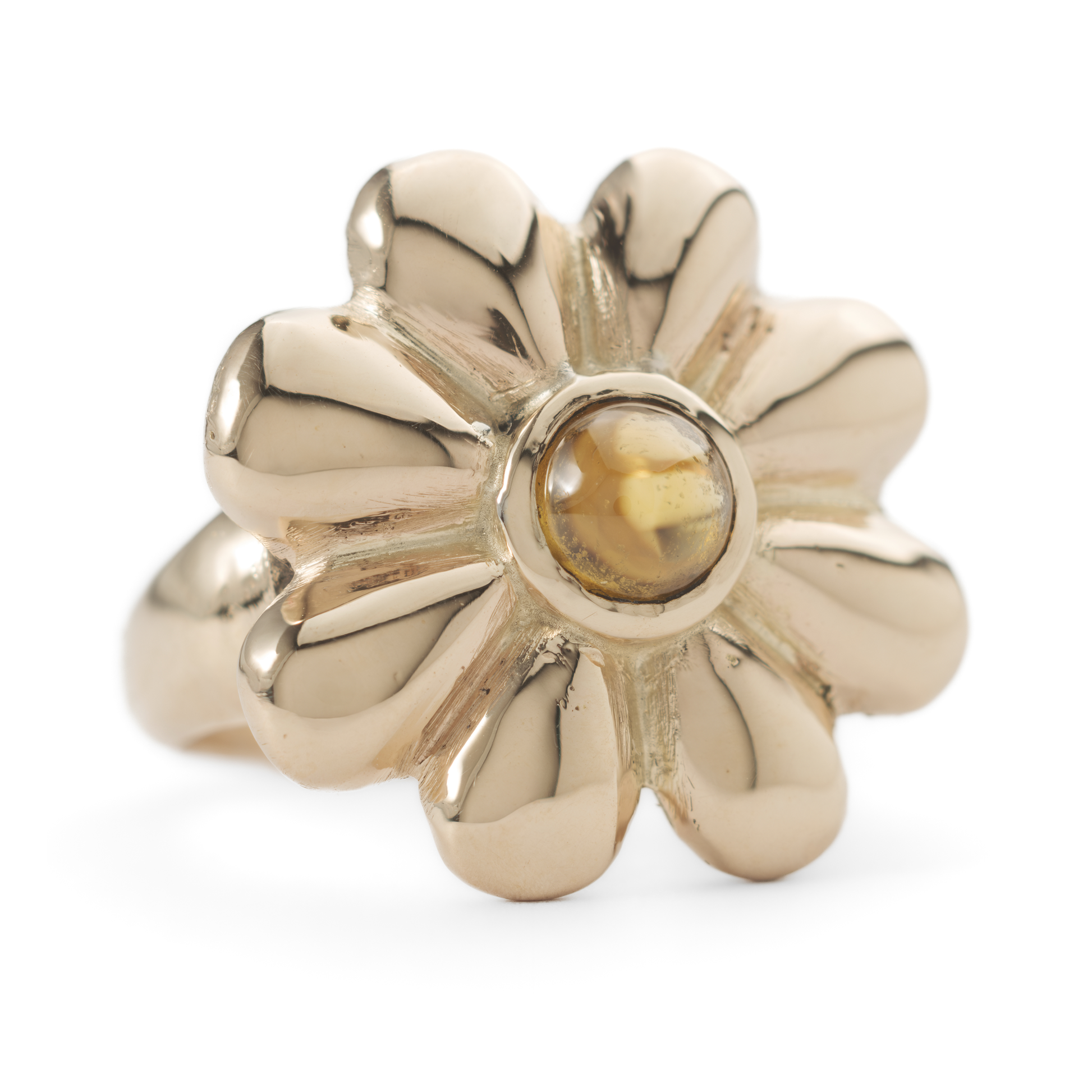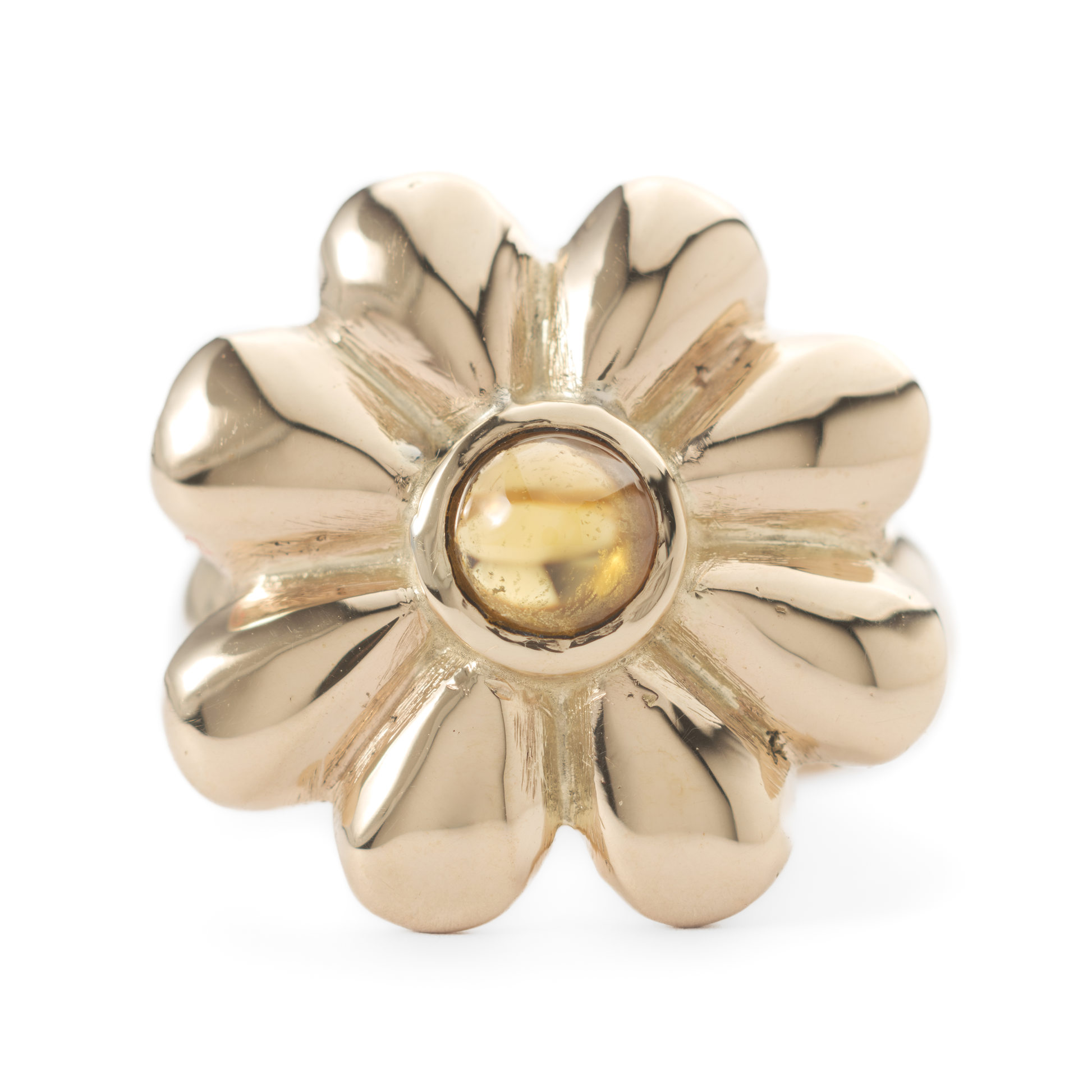 Hand carved flower signet with .61ct natural sapphire cabochon at center. Can be resized up or down two sizes, please email us after with confirmed ring size