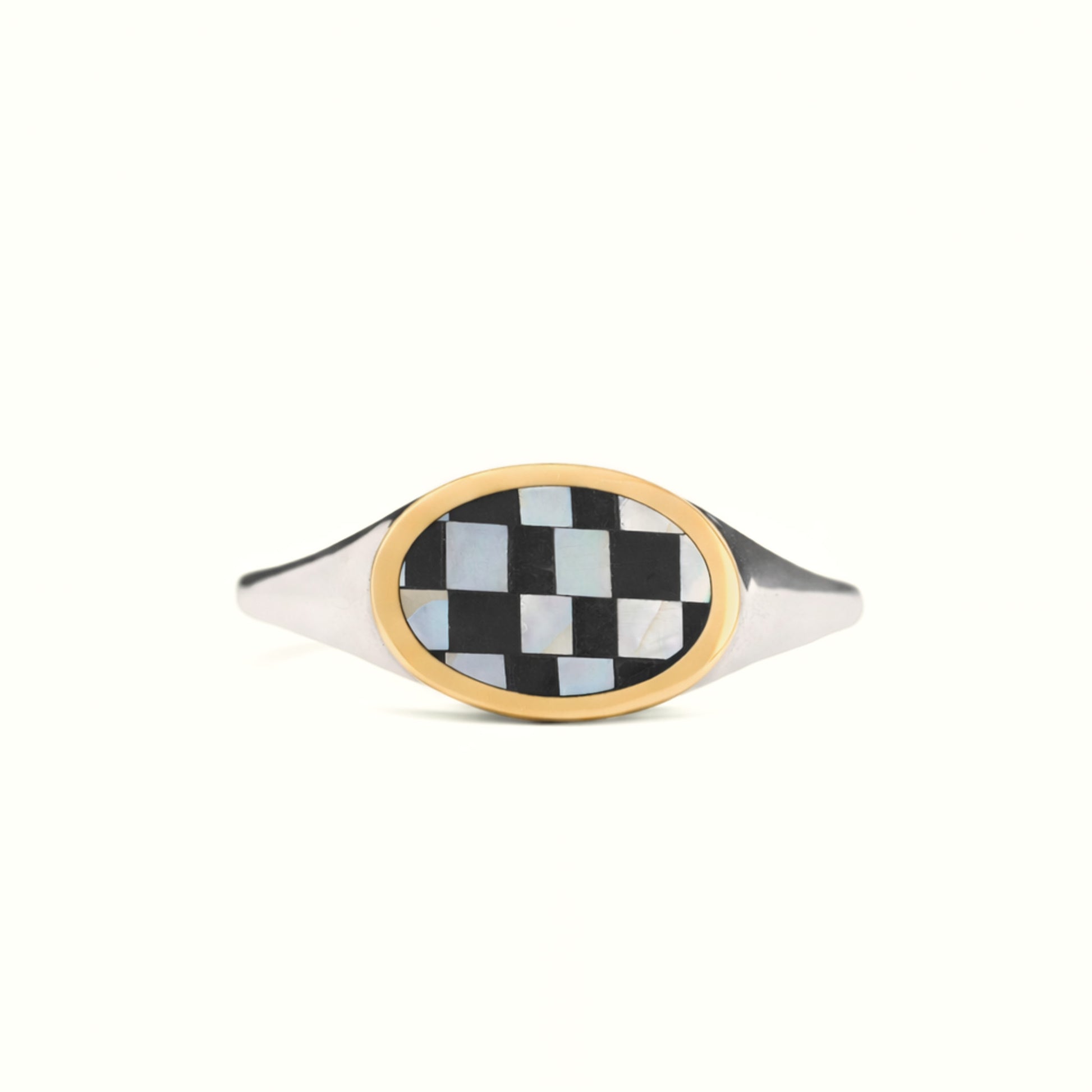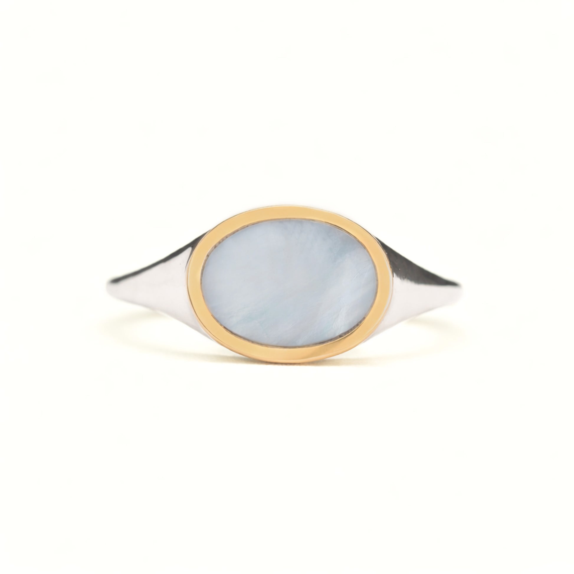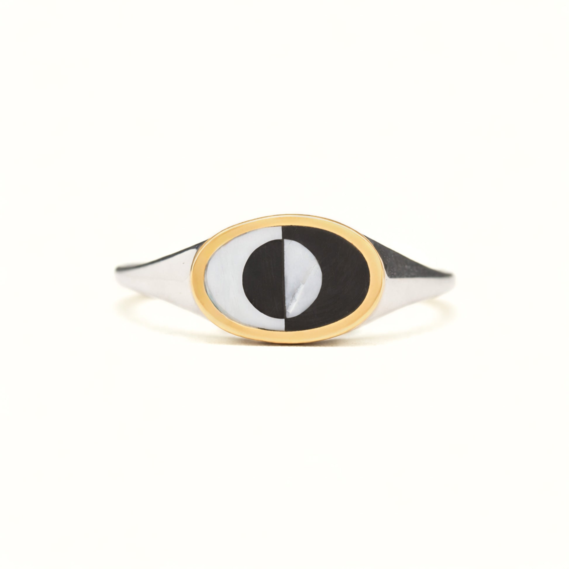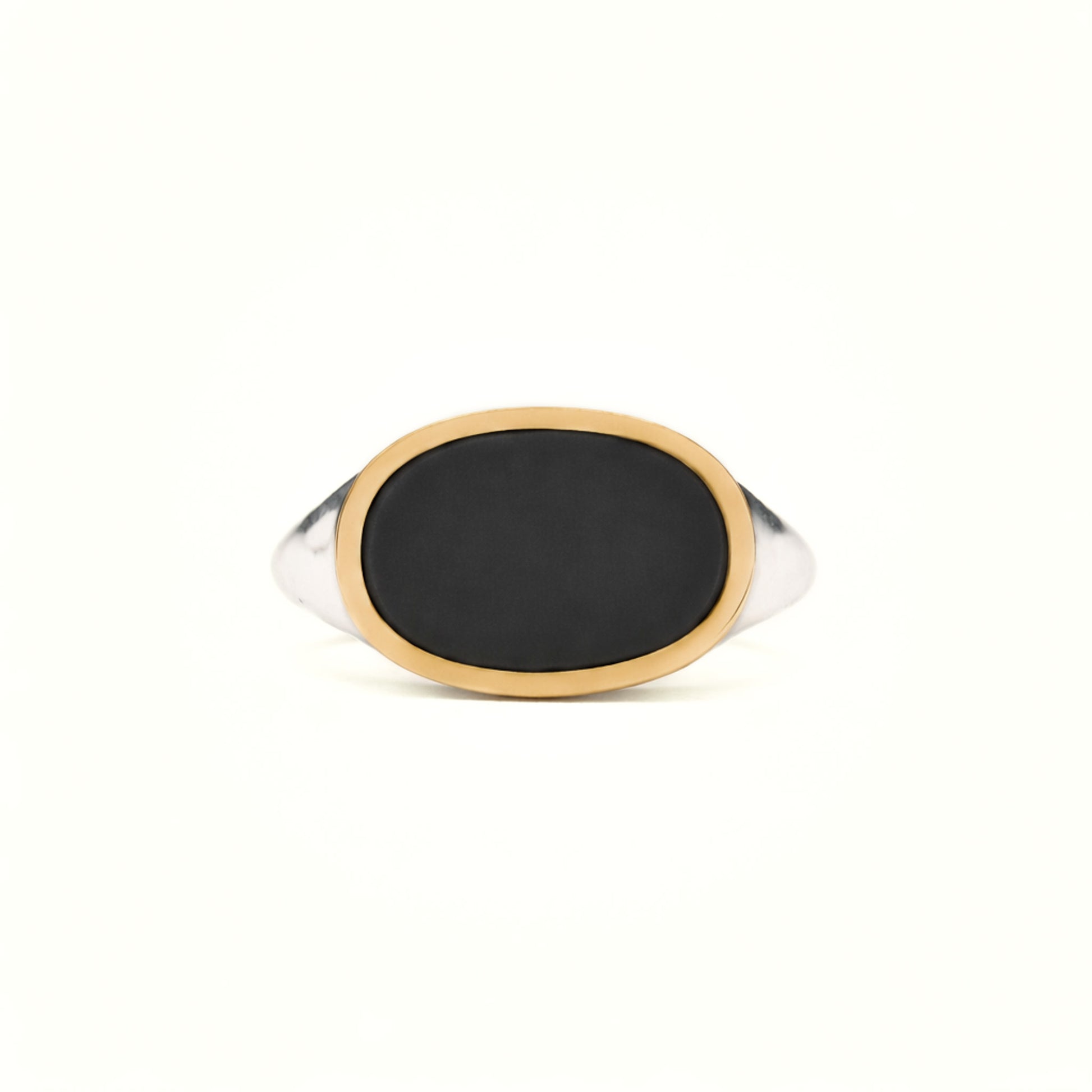 Sterling silver ring has a 14k yellow gold bezel and inlaid stone. Signet measures 13 mm by 9 mm and band tapers to 2 mm.