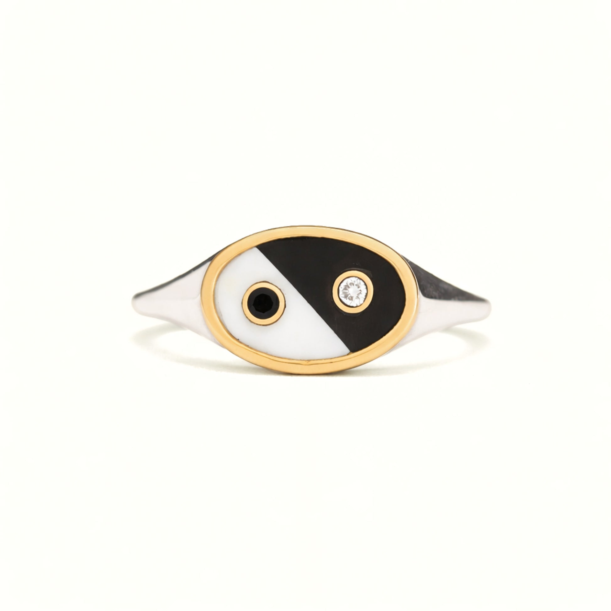 Balance design features two 2mm natural black and white diamonds in 14k yellow bezels sub inlaid into the stone
