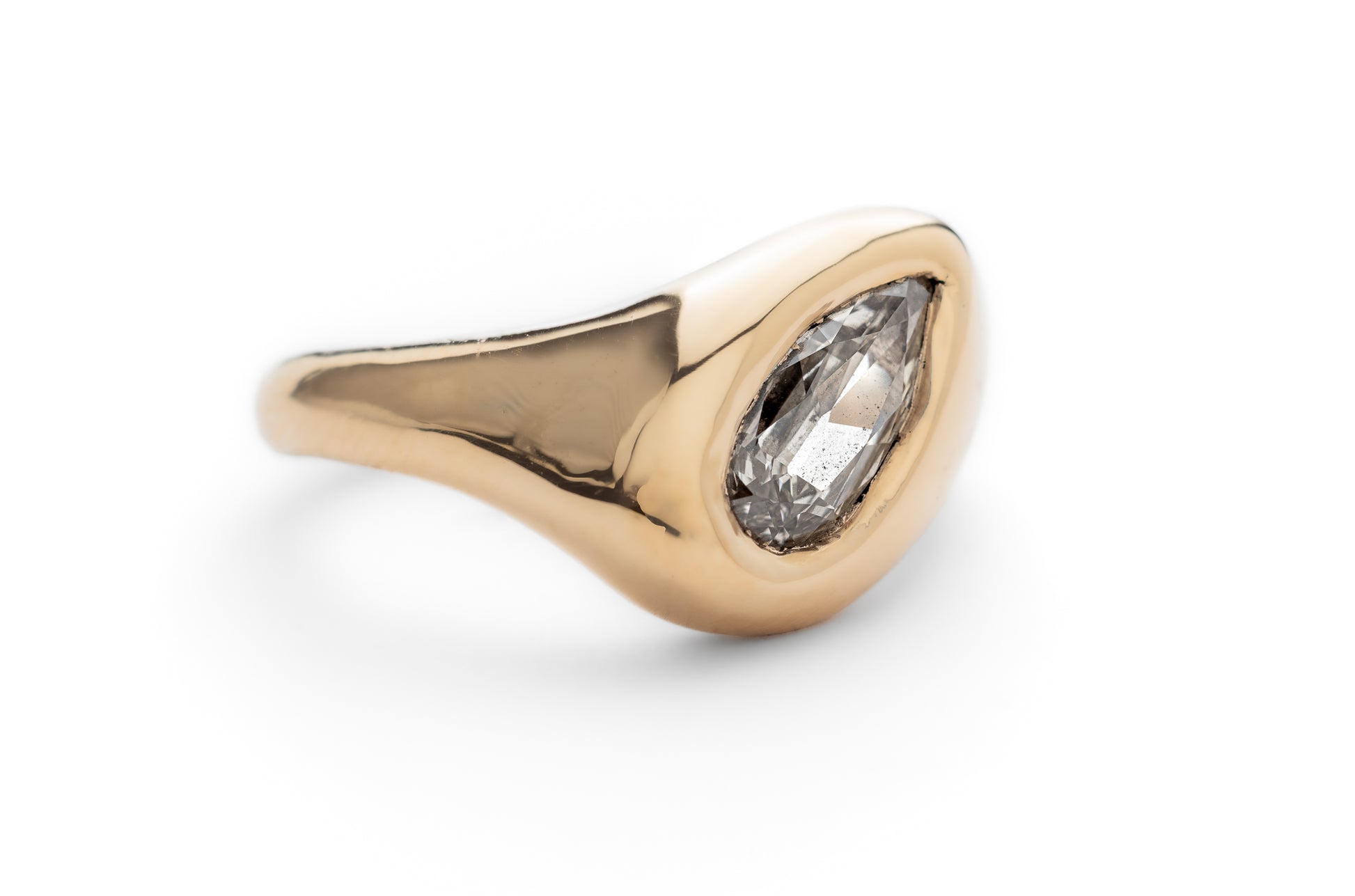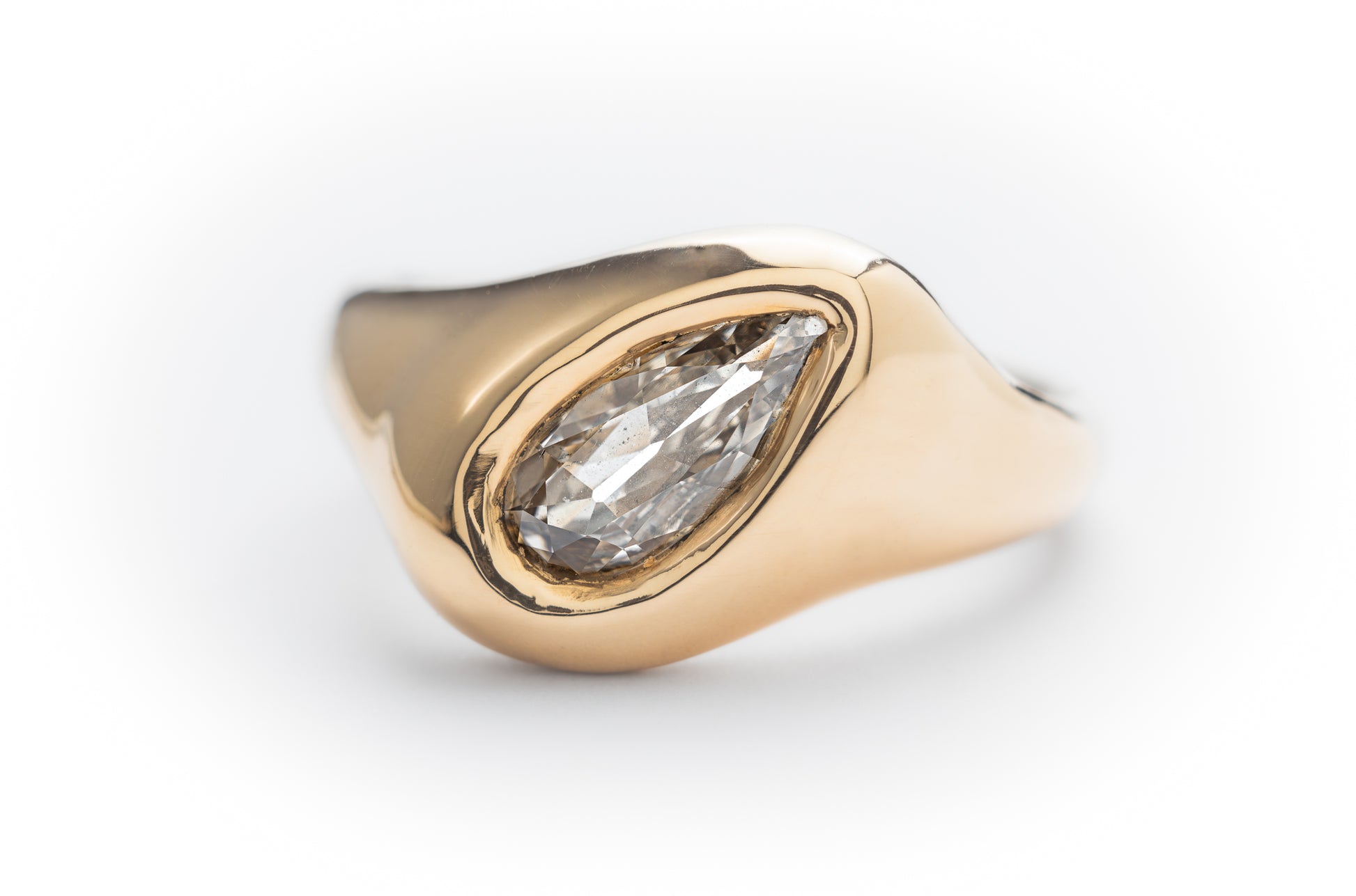14k hand carved organic signet style with a uniquely shaped light brown diamond. This stone is GIA certified as a modifed pear brilliant, S-T color, VS2 clarity.