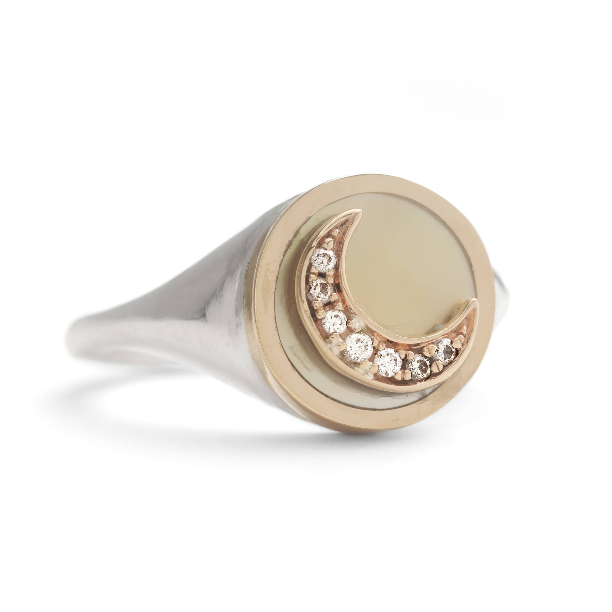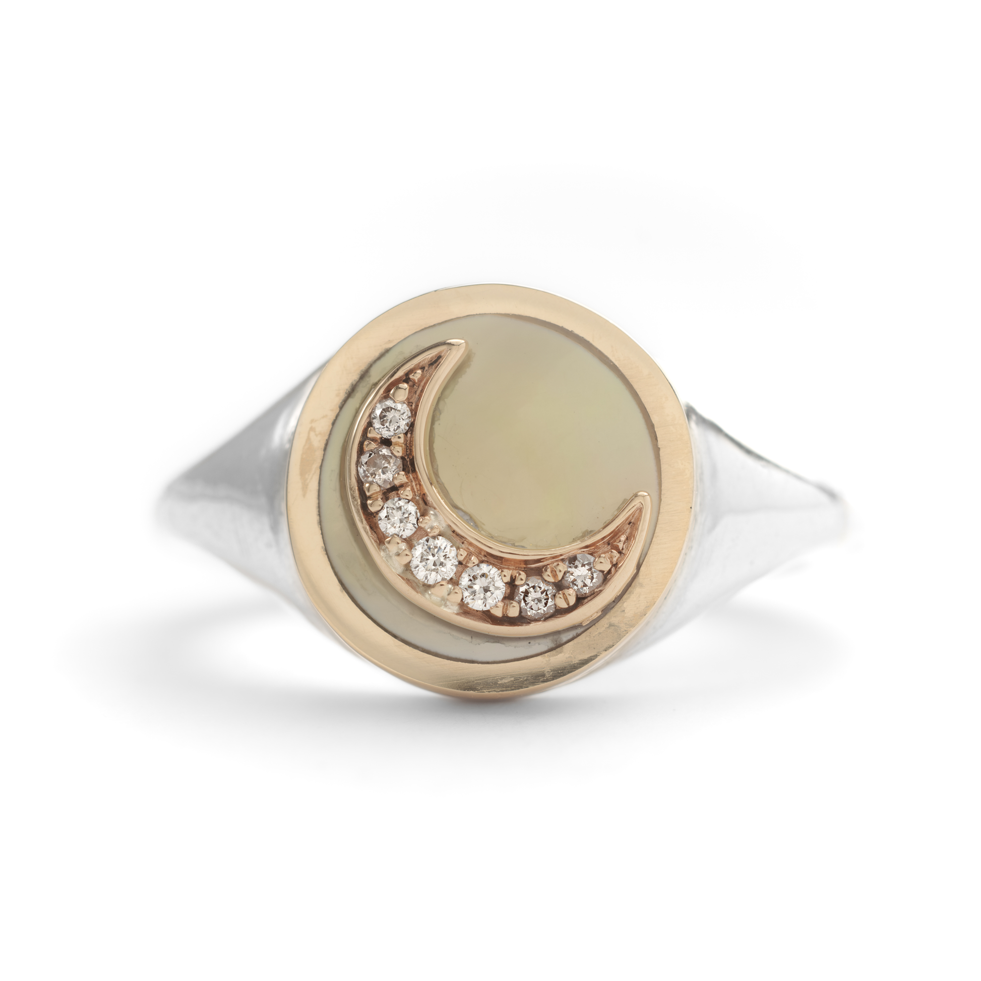 Hand-cut pearl in a 14k yellow gold bezel and sterling ring, with a sparkly natural diamond moon with .05 tcw