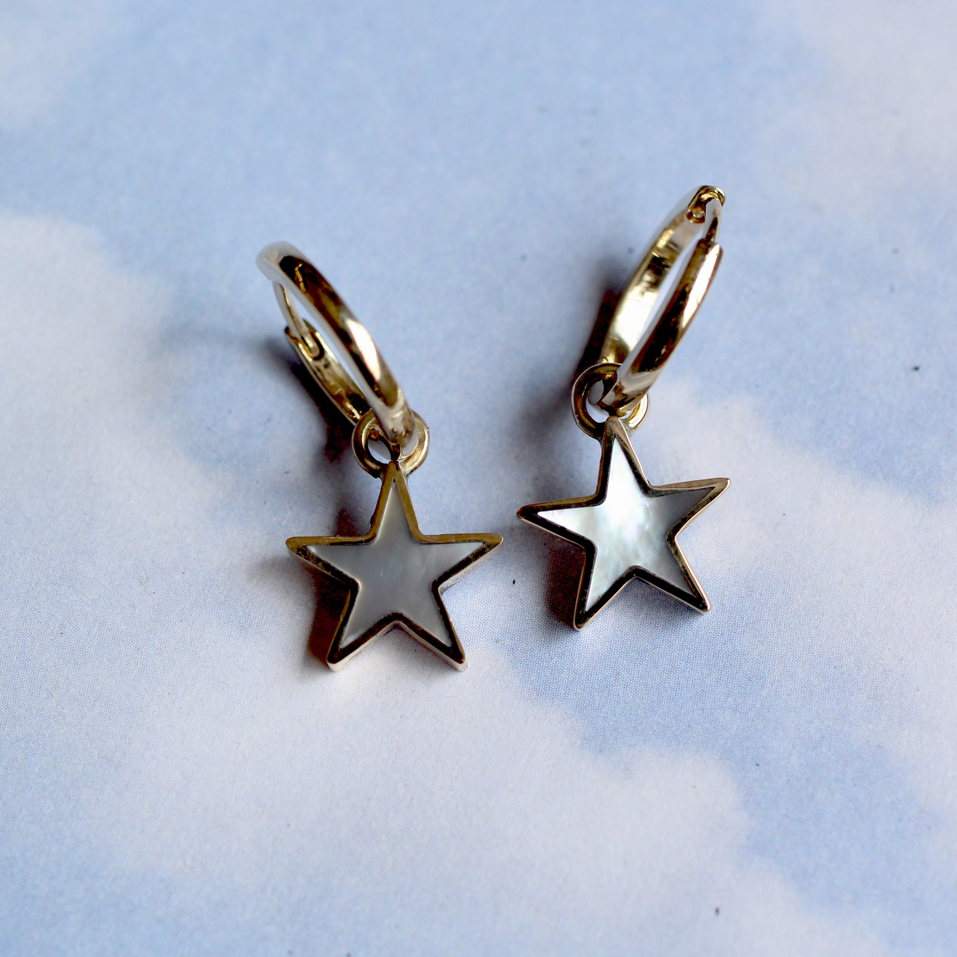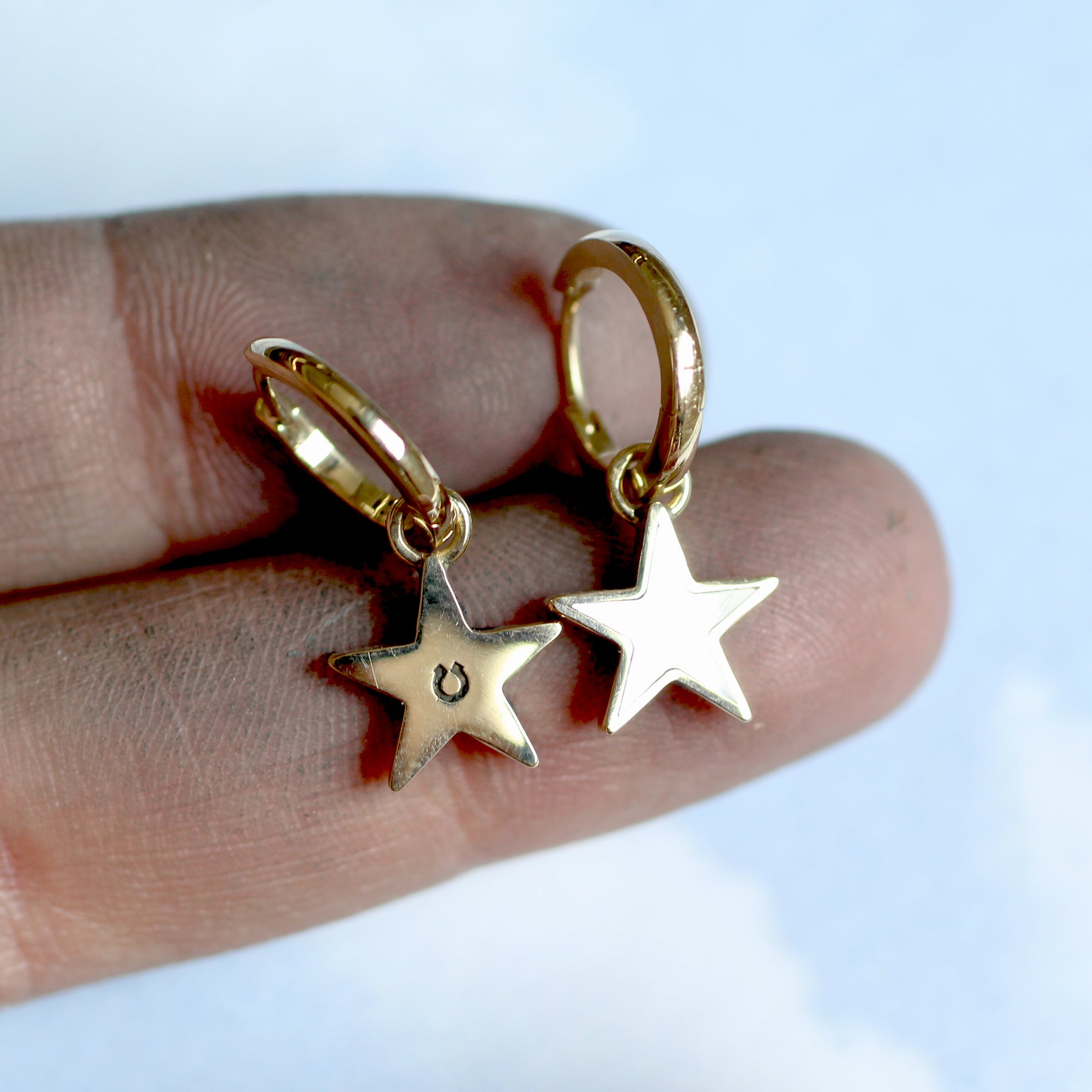 Inlaid mother of pearl stars hanging from 12.5mm 14k huggie hoops. Charms can be worn with the horseshoe makers mark, or be removed to wear hoops alone.